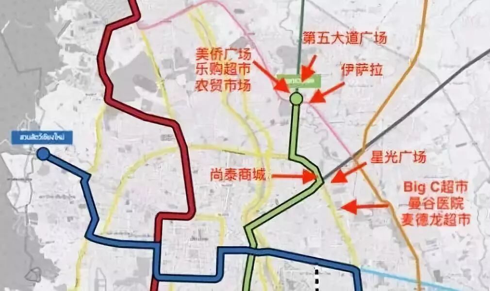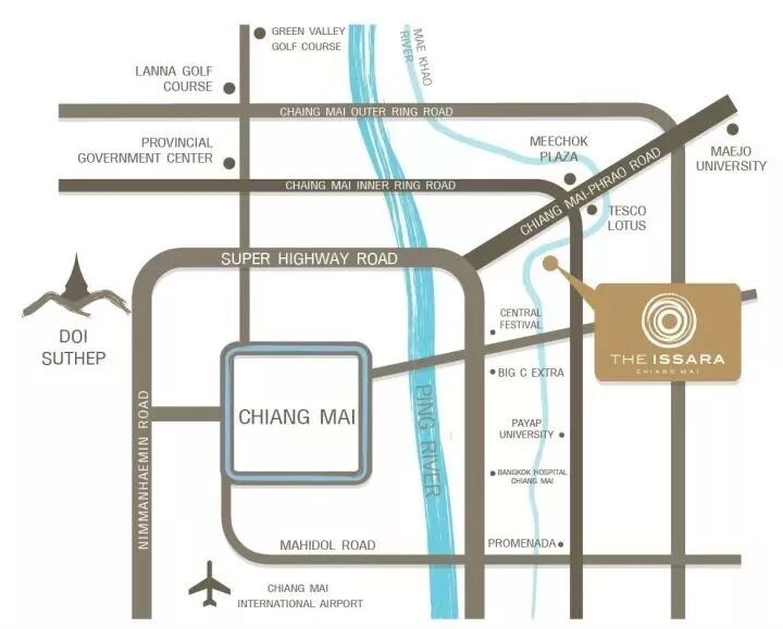 美侨生活圈位处清迈北环线,是通向清莱的两处要道之一,也是北环线居民区的消费中心,伊萨拉步行至美侨广场大约花时10分钟,驾车或者用打车APP(Grab)可以快速抵达临近的商圈,另外,据清迈交通局规划,在此未来将会开通轻轨绿色线: